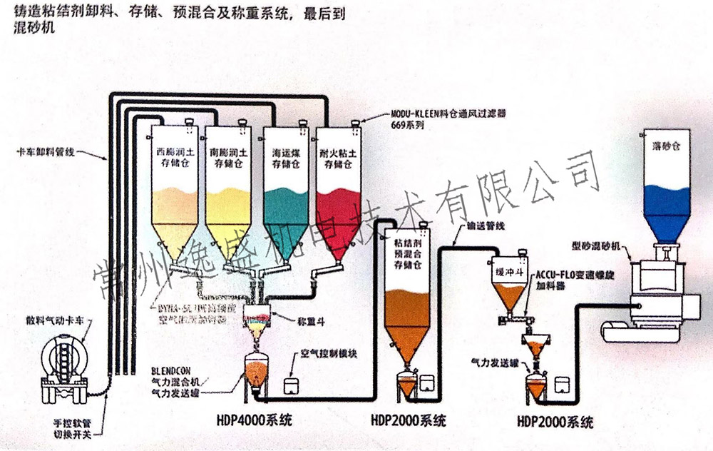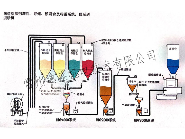 铸造粘结剂卸料、存储、预混合及称重系统,最后到混砂机