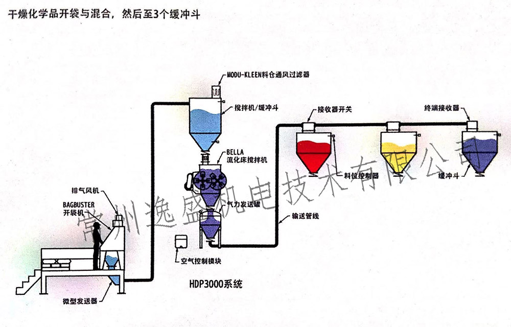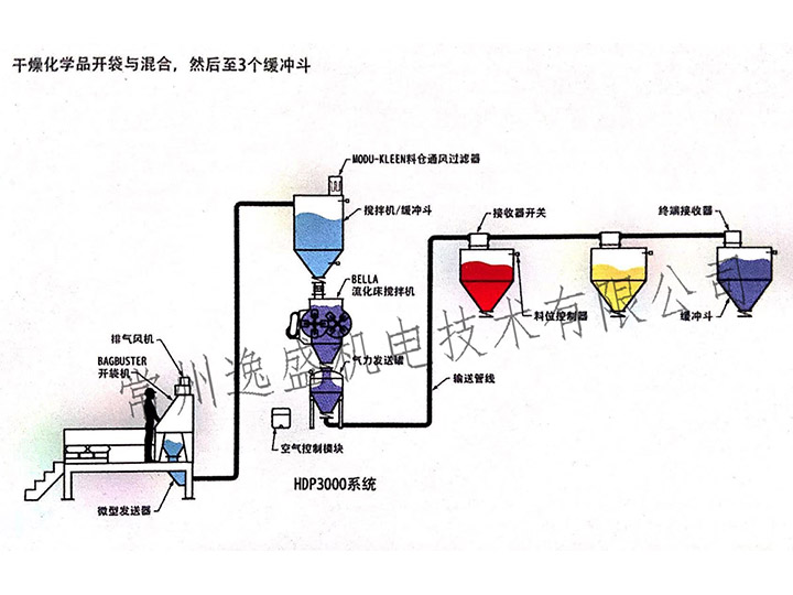 案例详情:干燥化学品开袋与混合,然后至3个缓冲斗